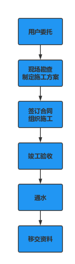 二、用户委托---建设工程有限公司现场踏勘---供水施工方案---签订合同---建设工程有限公司组织安全文明施工---竣工第三方验收---通水---移交(供水设施及技术档案)