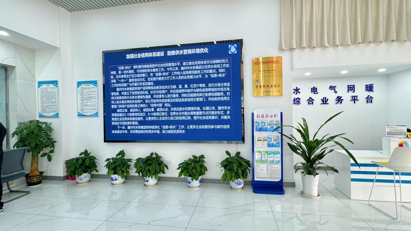 随州水务集团结合“世界水日”“中国水周”等重要节点,开展一系列供水诚信服务进社区宣传活动,通过“水电气”共享营业厅屏幕滚动播放宣传视频,还利用“随州水务”微信公众号、官方网站和新媒体平台等各类宣传途径,宣传供水信用服务体系建设,为推动供水信用体系建设落地落实打下坚实基础。