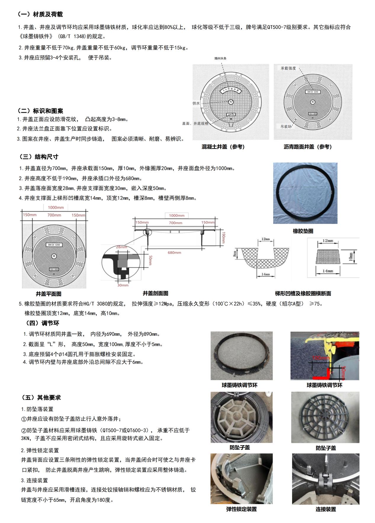 1、井盖、井座及调节环均应采用球墨铸铁材质,球化率应达到80%以上,球化等级不低于三级,牌号满足QT500-7级别要求。其它指标应符合《球墨铸铁件》(GB/T 1348)的规定。(附相关产品合格证明书);