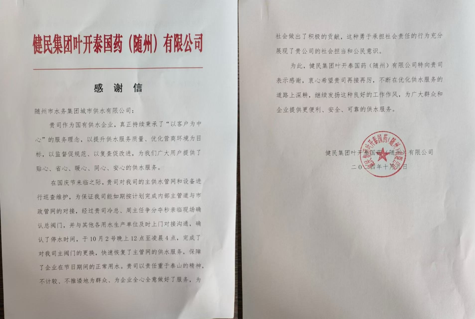 健民集团叶开泰国药(随州)有限公司负责人表示:“非常感谢供水公司人员的热情服务,及时为企业排忧解难,保障企业生产用水需求,真正为企业办好事办实事。这种勇于承担社会责任的行为充分展现了随州水务的社会担当和公民意识。”