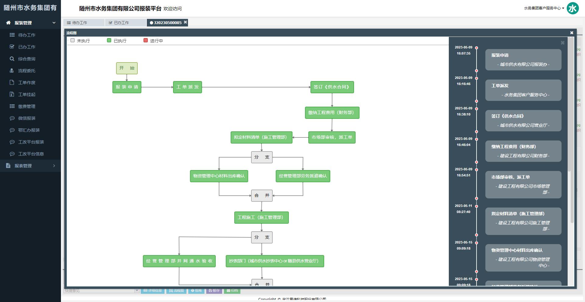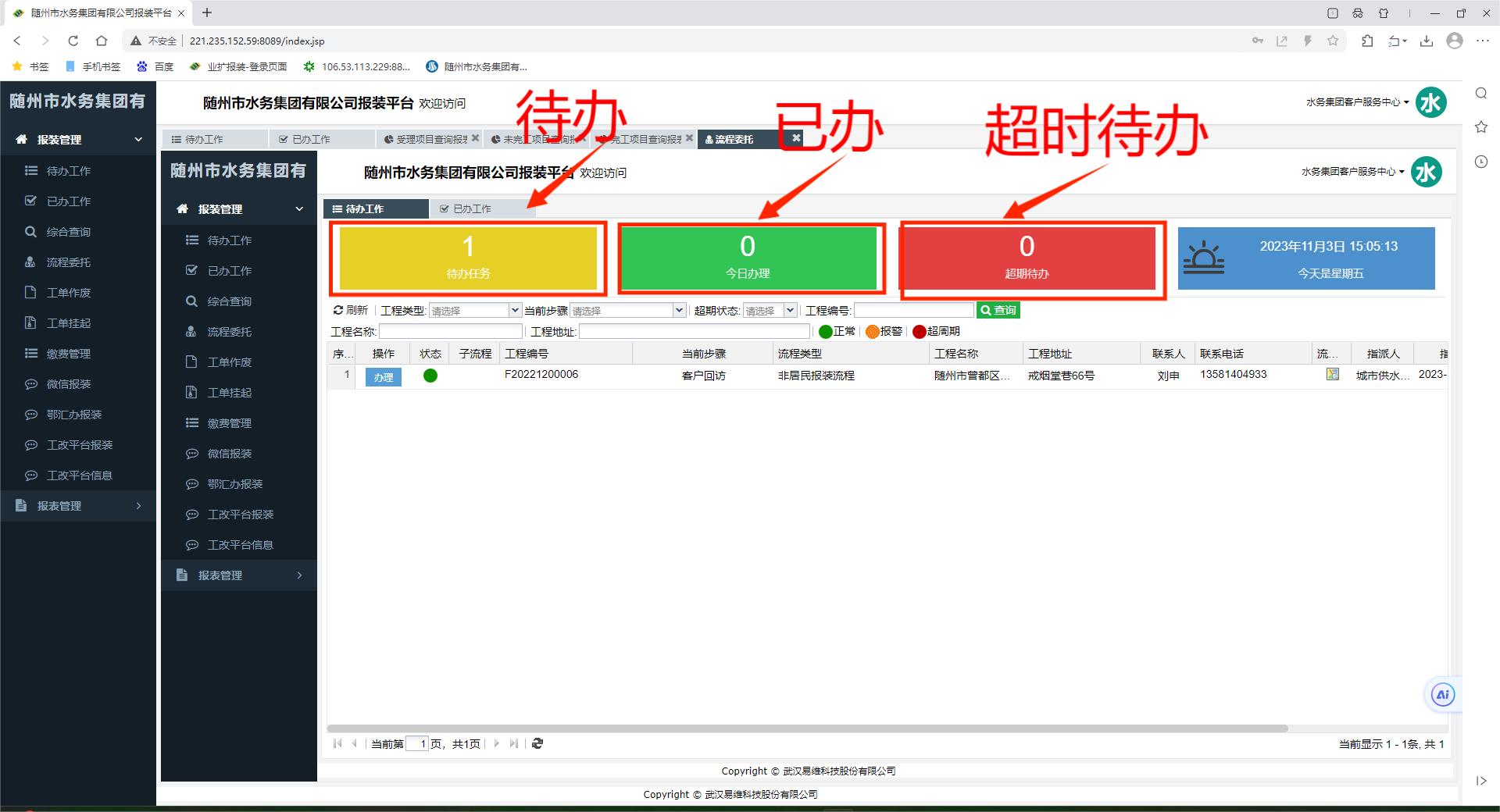 报装业务管理系统通过流程监测,对“待办,已办,超时待办”的业务进行分别处理,保证业务有效流转,及时办结。