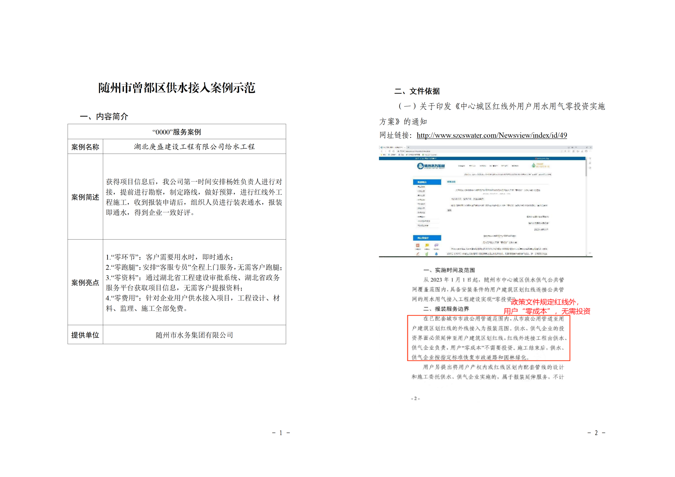 随州市水务集团主要职责是向随州市中心城区、曾都区、随县以及高新区提供供水服务,集团公司下辖城市供水公司、建设工程公司、水质检测公司、随县供水公司、康润实业公司5家全资子公司。下面展示随州市曾都区供水接入案例示范。
