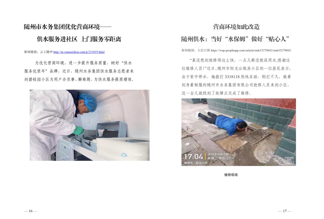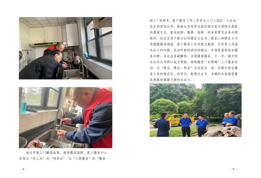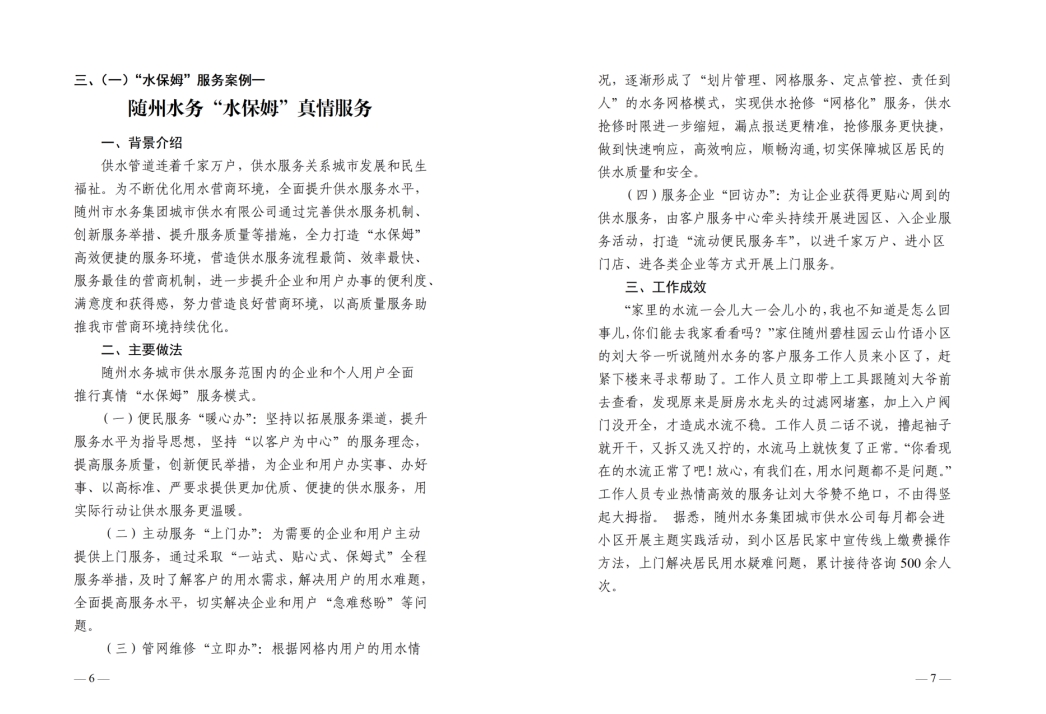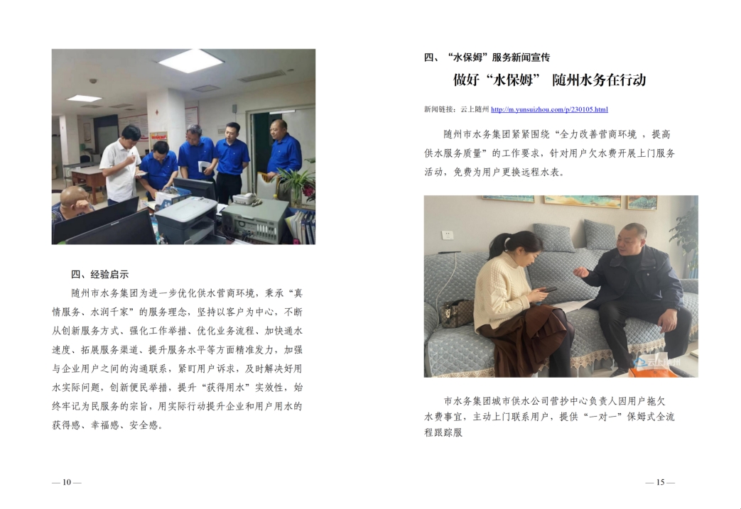 为全面提升供水服务水平,优化供水营商环境,随州水务集团推出“水保姆”供水服务新模式,建立“供水服务网格员”队伍,通过开展清表核查、网格划分、联合社区共同解决用户问题等亮点行动,让百姓暖心,让企业放心。