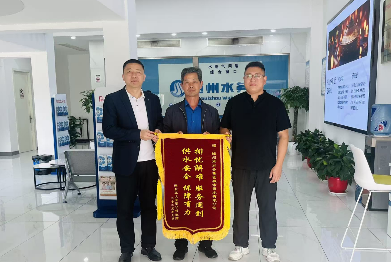 一面锦旗,一份认可。近日,湖北正大有限公司代表将一面印着“排忧解难 服务周到 供水安全 保障有力”的锦旗,郑重送到随州市水务集团城市供水公司工作人员手中。锦旗上的字迹虽简,却满含企业对供水服务的由衷感谢,更成为对随州水务人专业精神与责任担当的生动褒奖。