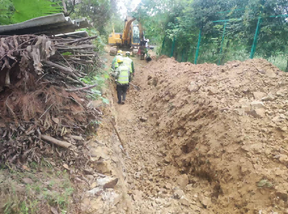 机电学校DN250球墨管供水工程线路处于山地丘陵地带,沿线涉及乡村道路、开垦菜园、陡峭山体等多重地质和复杂环境考验。在沿机电学校围墙边缘铺设段,乡村道路与围墙之间不足3米的狭窄空间,成为施工线路上的“拦路虎”,该道路是周边居民日常出行的主要通道,一旦长时间阻断,将严重影响群众生活。项目部与学校和村委共同研讨下,最终确定利用2天时间,集中突击,调用多台设备,全力冲刺,快速施工完成后复路于民,顺利啃下硬骨头。