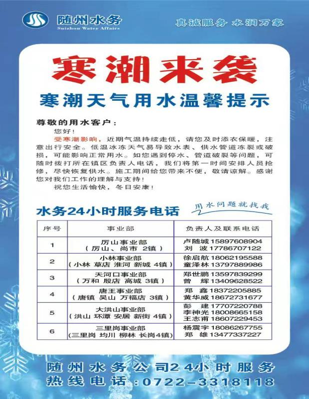 近期,我市持续遭遇低温寒潮,严寒天气对城乡供水管网及设施构成严峻挑战,水务集团随县供水公司迅速激活应急响应机制,提前部署筑防线、精准服务解民忧、全员坚守保畅通的硬核举措,切实保障居民冬季用水无忧。